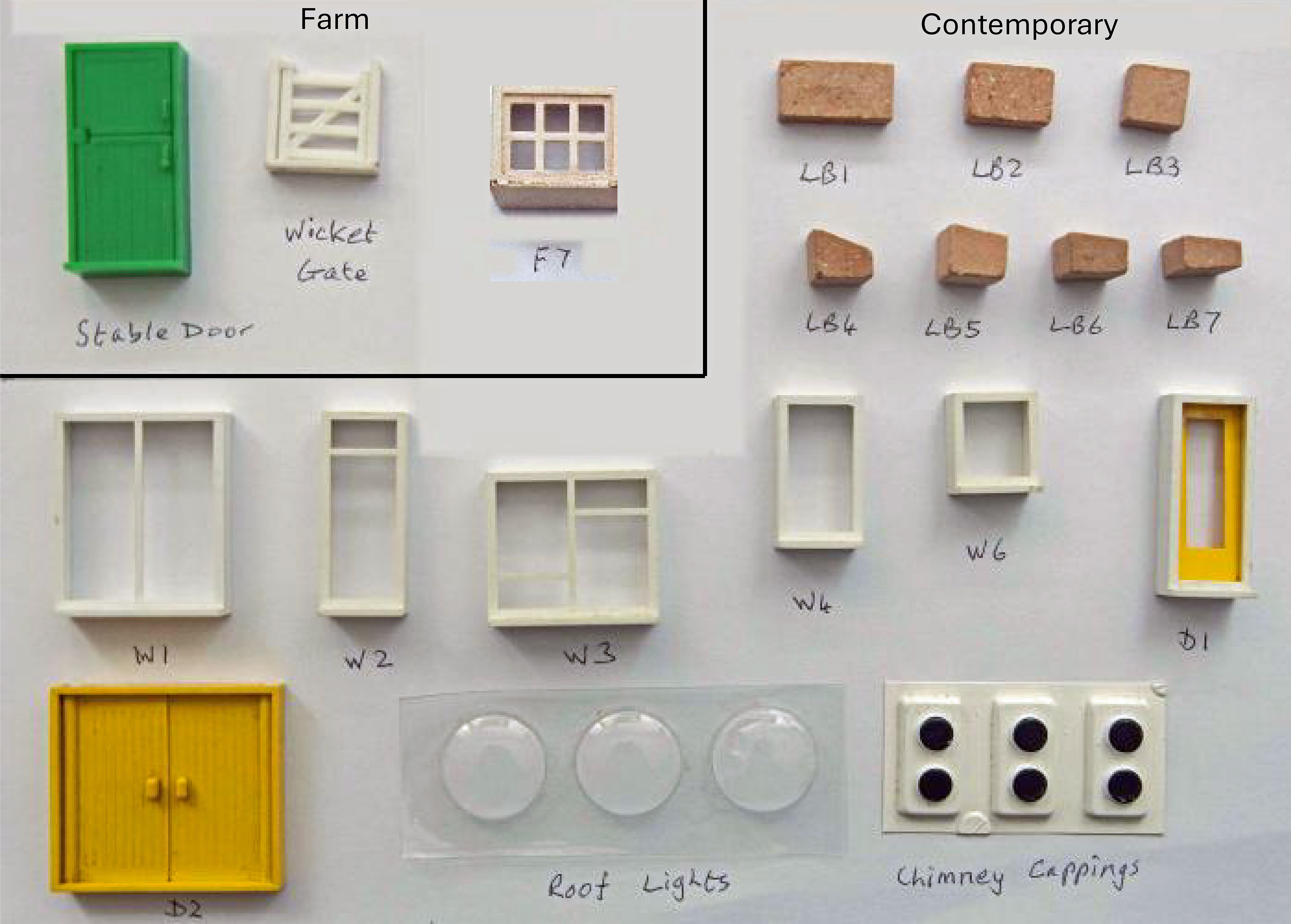 The Standard Brickplayer windows F1 to F6 are used, but the Farm Kit's F7 window also appears. The larger (garage) doors are a little different and coloured green. In the kits I have, these doors are solid, but perhaps Spears at some point changed to opening doors, like the F15 and F16 of the later Standard Kits 3 and 4.
