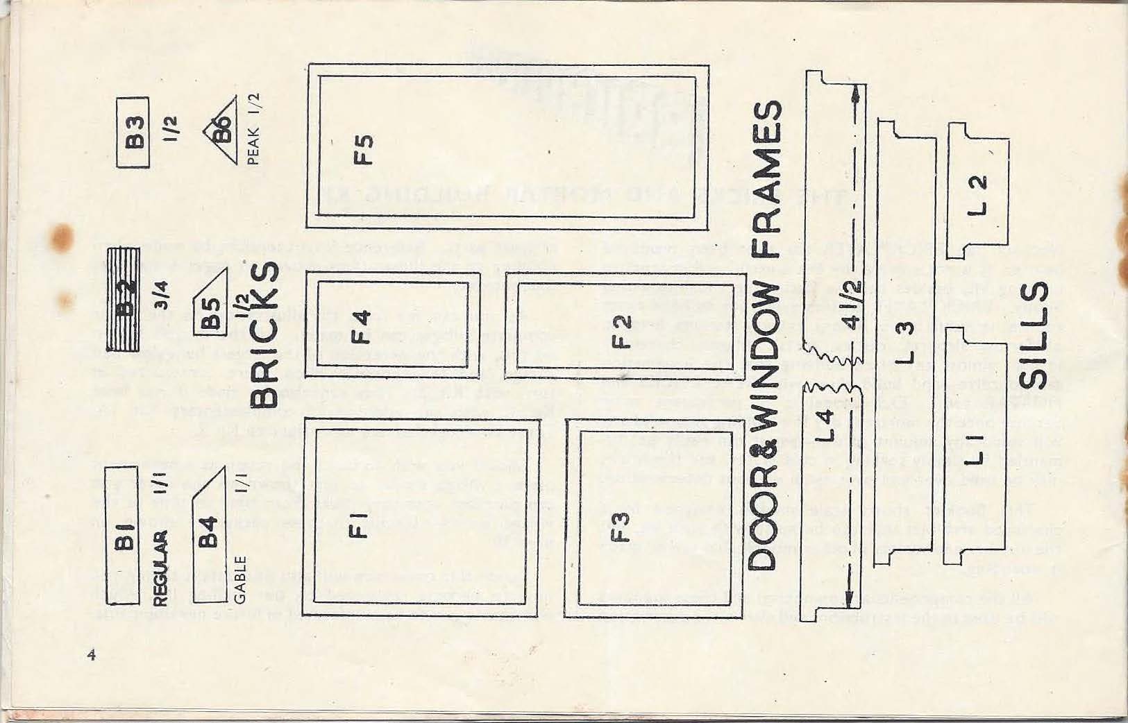 The images below are from an Early Brickplayer instruction booklet, and show the windows and doors. The door frame F5 is substantially larger than in Standard Brickplayer since it is at 1:27 scale. It scales up correctly to a regular door size in the building plans.