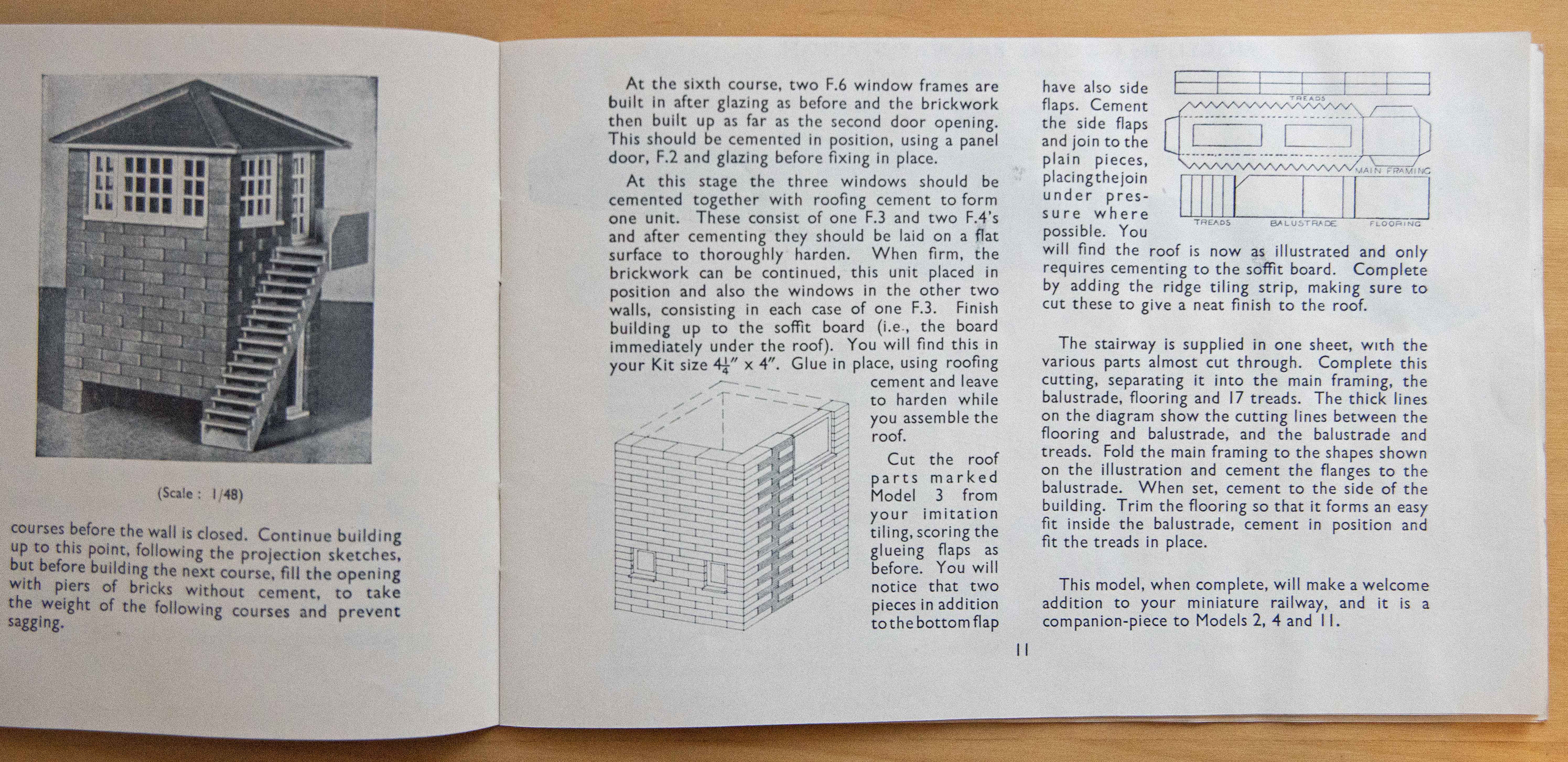 On the left is the earlier version, with the later version on the right. Instructions for constructing them are shown in pages from their instruction books below. The earlier version was much more fiddly to build, requiring each tread to be separately glued to the sides.