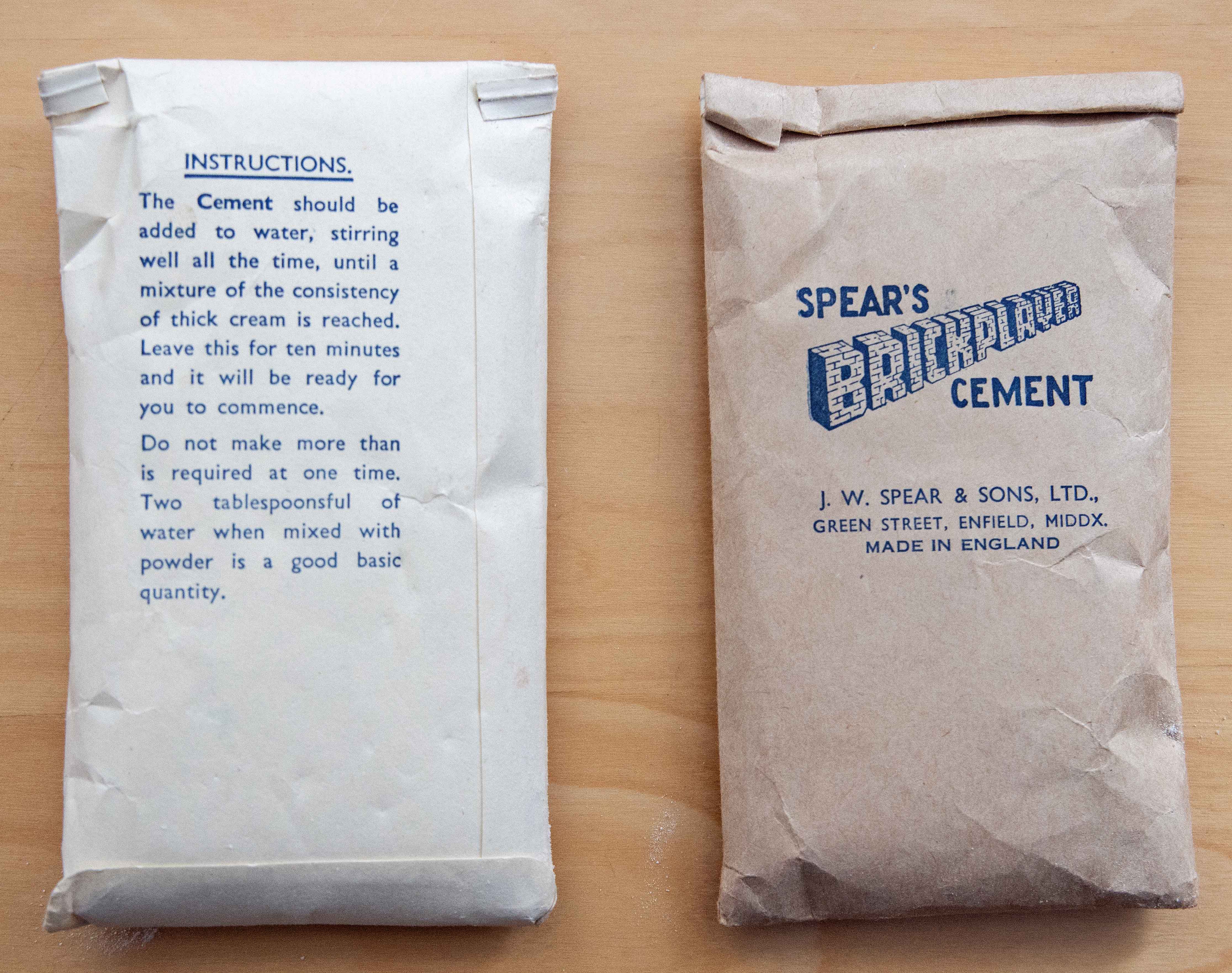Cement from a Pre-War Kit B5 is shown on the left. It is supplied in a cloth bag with instructions on the bag specifying that (a) it must be mixed by adding one part of cement to five parts water and (b) models must be separated in cold water. The latter injuction is reinforced in the building instructions for the Pre-War kits which stressed not to use hot water.